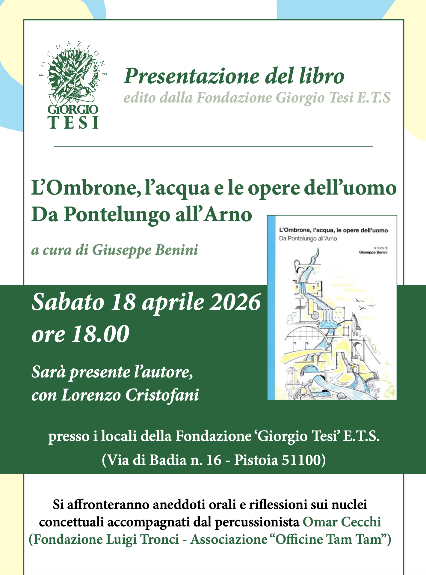 Sabato 18 aprile 2026 alle ore 18.00 si terrà la presentazione del libro “L’Ombrone, l’acqua e le opere dell’uomo. Da Pontelungo all’Arno”, presso i locali della Fondazione ‘Giorgio Tesi’ E.T.S.